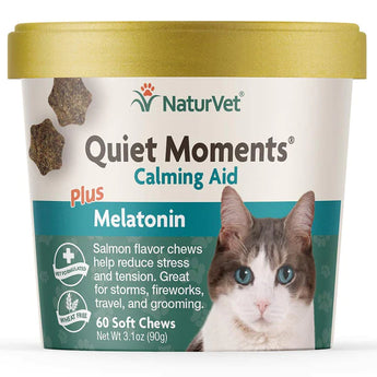 Quiet Moments® Cat Soft Chews is for use in cats over the age of 12 weeks. Our unique blend of Thiamine and L‑Tryptophan help reduce stress and tension. Ginger supports sensitive stomachs which is especially important when traveling, while Melatonin helps to promote rest and relaxation.
