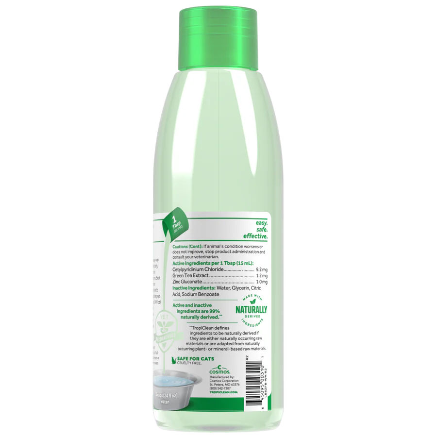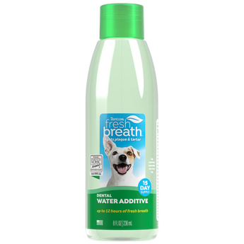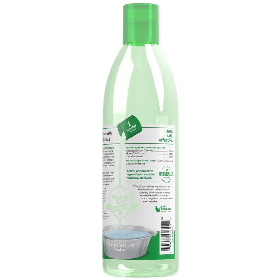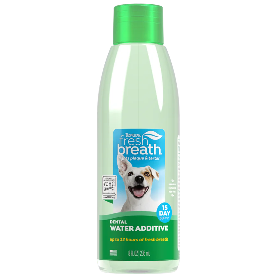 TropiClean Fresh Breath Oral Care Water Additive for Pets makes dental care simple, giving your dog or cat cleaner teeth and fresher breath—no brushing required! Just add this tasteless, odorless solution to their water bowl once daily for up to 12 hours of fresh breath and ongoing plaque and tartar defense. VOHC-accepted and made with naturally derived ingredients, this easy-to-use pet mouthwash helps maintain a healthy mouth and supports overall wellness.