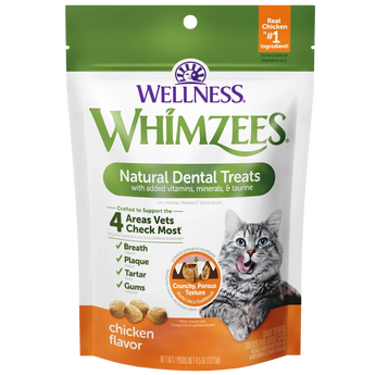 You brush daily, your cat should too! Wellness WHIMZEES® cat treats are designed to act like a toothbrush to help support the four areas vets check most - breath, plaque, tartar, and gums - all while the chew. Our scientifically crafted treats are complete & balanced for adult cats and taste great!