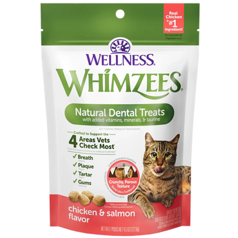 You brush daily, your cat should too! Wellness WHIMZEES® cat treats are designed to act like a toothbrush to help support the four areas vets check most - breath, plaque, tartar, and gums - all while the chew. Our scientifically crafted treats are complete & balanced for adult cats and taste great!