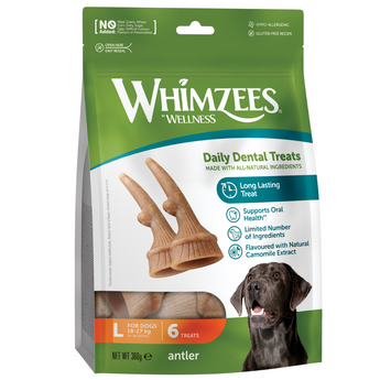 Visit Whimzees Website to know more about Whimzees Antler Large Natural Dental Dog Chews (6Pcs)