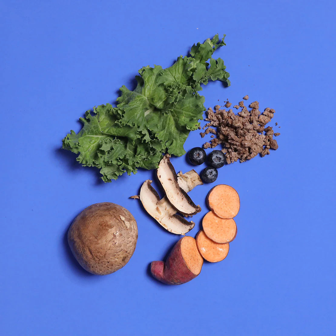 Plant-Based Protein, Pumpkin, Shiitake Mushrooms, Sweet Potato, Blueberries, Ground Sunflower Seeds, Ground Pumpkin Seeds, Ground Chia Seeds, Kale, Vitamin E & D, Ground Brazil Nuts, Ground Peanuts, Papaya, Ground Flaxseeds, Yeast, Vitamin B Complex, Algal Omega 3, Calcium Carbonate, Coconut Oil, Wheatgrass, Spirulina, Kelp.