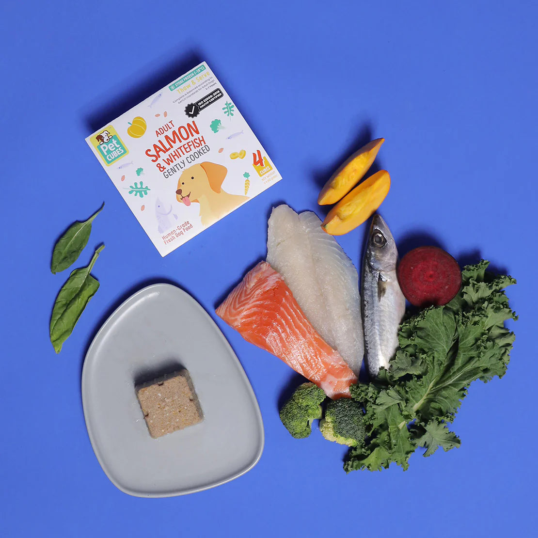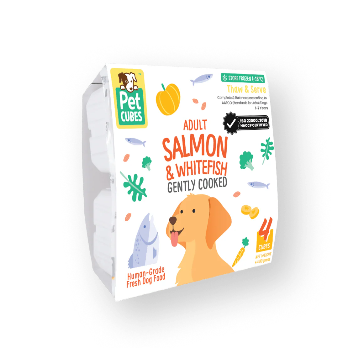 Visit Pet Cubes Website to know more about Pet Cubes Complete Gently Cooked Salmon & Whitefish Fresh Food For Dogs