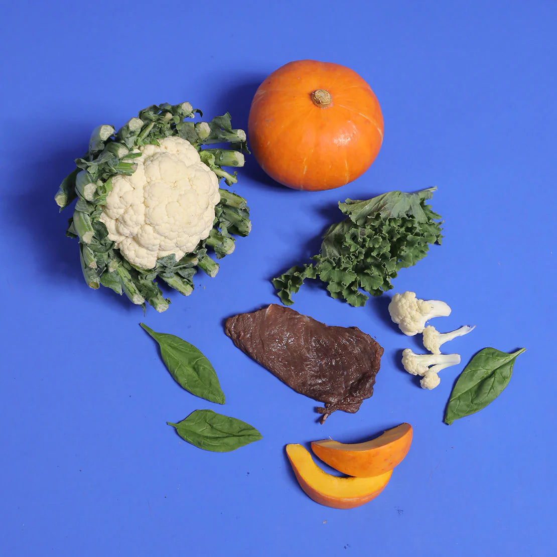 Venison Lean Muscle Meat, Pumpkin, Cauliflower, Venison Liver, Ground Germinated Sunflower Seeds, Bok Choy, Curly Kale, Coconut Oil, Broccoli, Barramundi Oil, Ground Pumpkin Seeds, Ground Eggshells, Organic Sea Kelp, Prebiotics & Probiotics Collagen Mix, Spirulina, Acai Berries, Ashwagandha Root, Milk Thistle, Turmeric, Black Pepper, Vitamin D, Vitamin E.