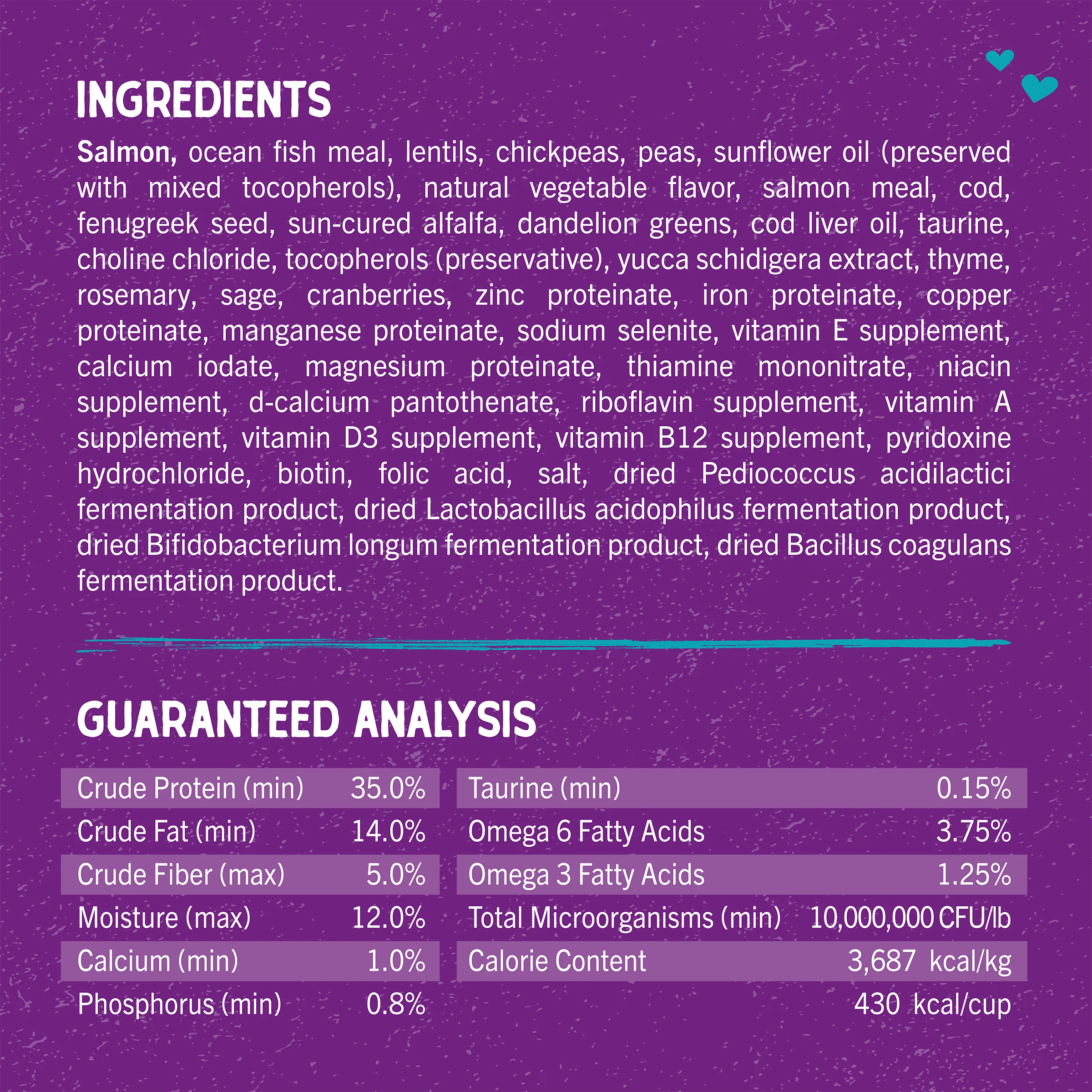 Salmon, Ocean Fish Meal, Lentils, Chickpeas, Peas, Sunflower Oil (Preserved with Mixed Tocopherols), Natural Vegetable Flavor, Salmon Meal, Cod, Fenugreek Seed, Suncured Alfalfa, Dandelion Greens, Cod Liver Oil, Taurine, Choline Chloride, Mixed Tocopherols (preservative), Yucca Schidigera Extract, Thyme, Rosemary, Sage, Organic Cranberries, Zinc Proteinate, Iron Proteinate, Copper Proteinate, Manganese Proteinate, Sodium Selenite, Vitamin E Supplement, Calcium Iodate, Thiamine Mononitrate, Niacin Supplement, D-calcium Pantothenate, Riboflavin Supplement, Vitamin A Supplement, Vitamin D3 Supplement, Vitamin B12 Supplement, Pyridoxine Hydrochloride, Biotin, Folic Acid, Salt, Dried Pediococcus Acidilactici fermentation product, Dried Lactobacillus Acidophilus fermentation product, Dried Bifidobacterium Longum fermentation product, Dried Bacillus Coagulans fermentation product