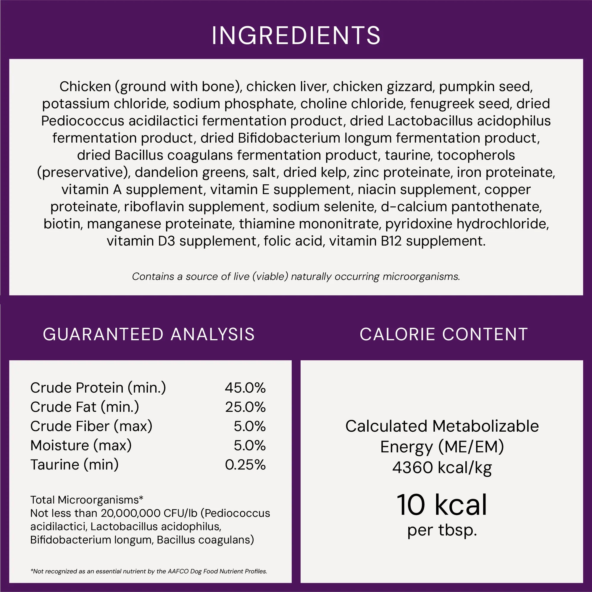 The data in our typical analysis is composed of calculated values using expected figures from ingredient databases and actual lab analyses of our foods. This table provides more detailed information than our Guaranteed Analysis but it is not intended to represent absolute values. This data is oftentimes helpful when determining if a specific recipe is suitable for a known dietary requirement. If you or your veterinarian have further questions, please contact us.
