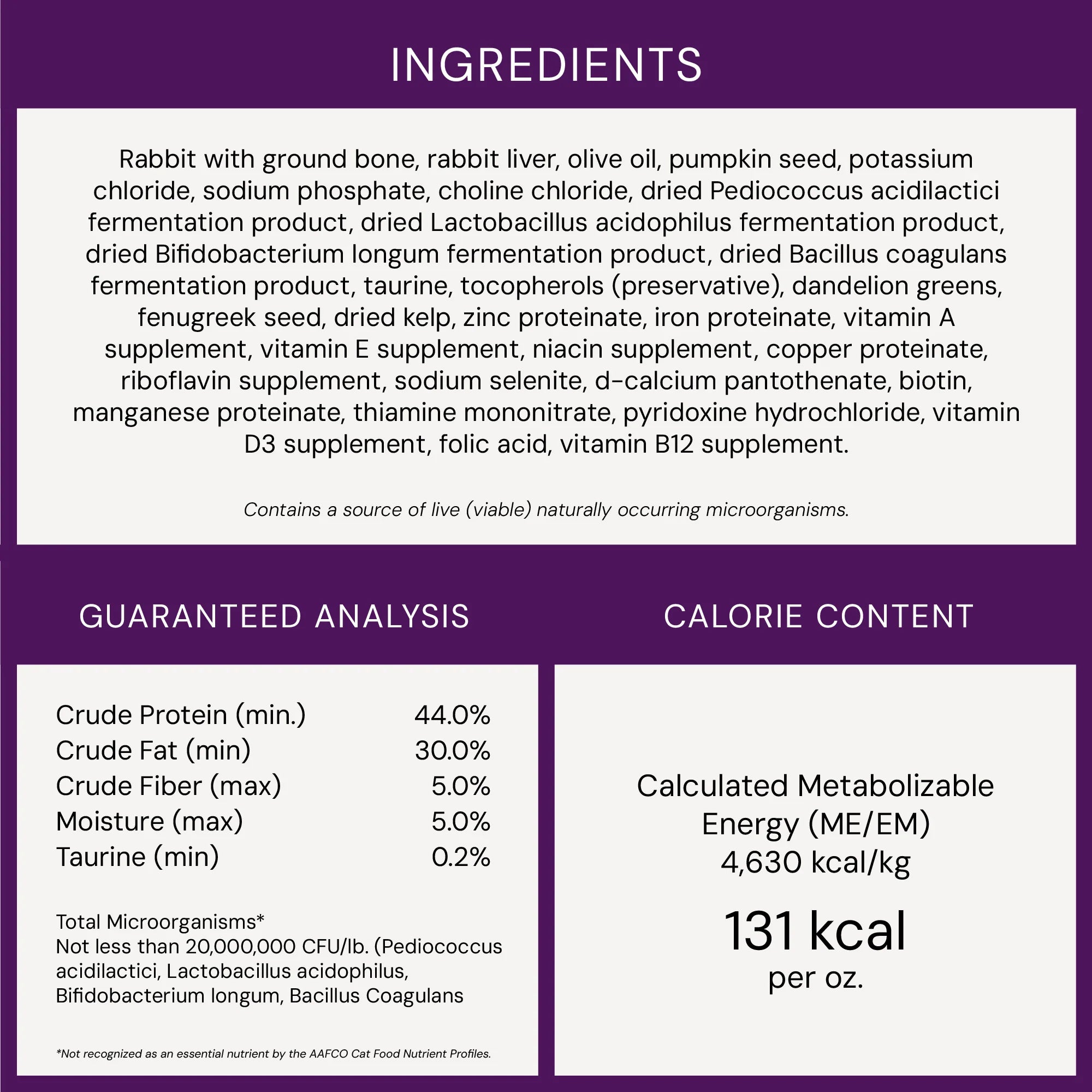Rabbit with Ground Bone, Rabbit Liver, Olive Oil, Pumpkin Seed, Potassium Chloride, Sodium Phosphate, Choline Chloride, Dried Pediococcus Acidilactici fermentation product, Dried Lactobacillus Acidophilus fermentation product, Dried Bifidobacterium Longum fermentation product, Dried Bacillus Coagulans fermentation product, Taurine, Mixed Tocopherols (preservative), Dandelion, Dried Kelp, Zinc Proteinate, Iron Proteinate, Vitamin A Supplement, Vitamin E Supplement, Niacin Supplement, Copper Proteinate, Riboflavin Supplement, Sodium Selenite, D-calcium Pantothenate, Biotin, Manganese Proteinate, Thiamine Mononitrate, Pyridoxine Hydrochloride, Vitamin D3 Supplement, Folic Acid, Vitamin B12 Supplement