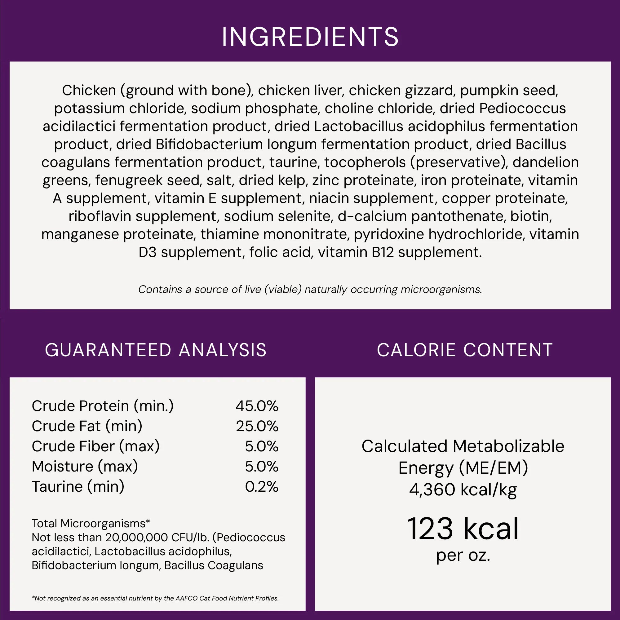 Chicken with Ground Bone, Chicken Liver, Chicken Gizzard, Pumpkin Seed, Potassium Chloride, Sodium Phosphate, Choline Chloride, Fenugreek Seed, Dried Pediococcus Acidilactici fermentation product, Dried Lactobacillus Acidophilus fermentation product, Dried Bifidobacterium Longum fermentation product, Dried Bacillus Coagulans fermentation product, Taurine, Mixed Tocopherols (preservative), Dandelion, Dried Kelp, Zinc Proteinate, Iron Proteinate, Vitamin A Supplement, Vitamin E Supplement, Niacin Supplement, Copper Proteinate, Riboflavin Supplement, Sodium Selenite, D-calcium Pantothenate, Biotin, Manganese Proteinate, Thiamine Mononitrate, Pyridoxine Hydrochloride, Vitamin D3 Supplement, Folic Acid, Vitamin B12 Supplement