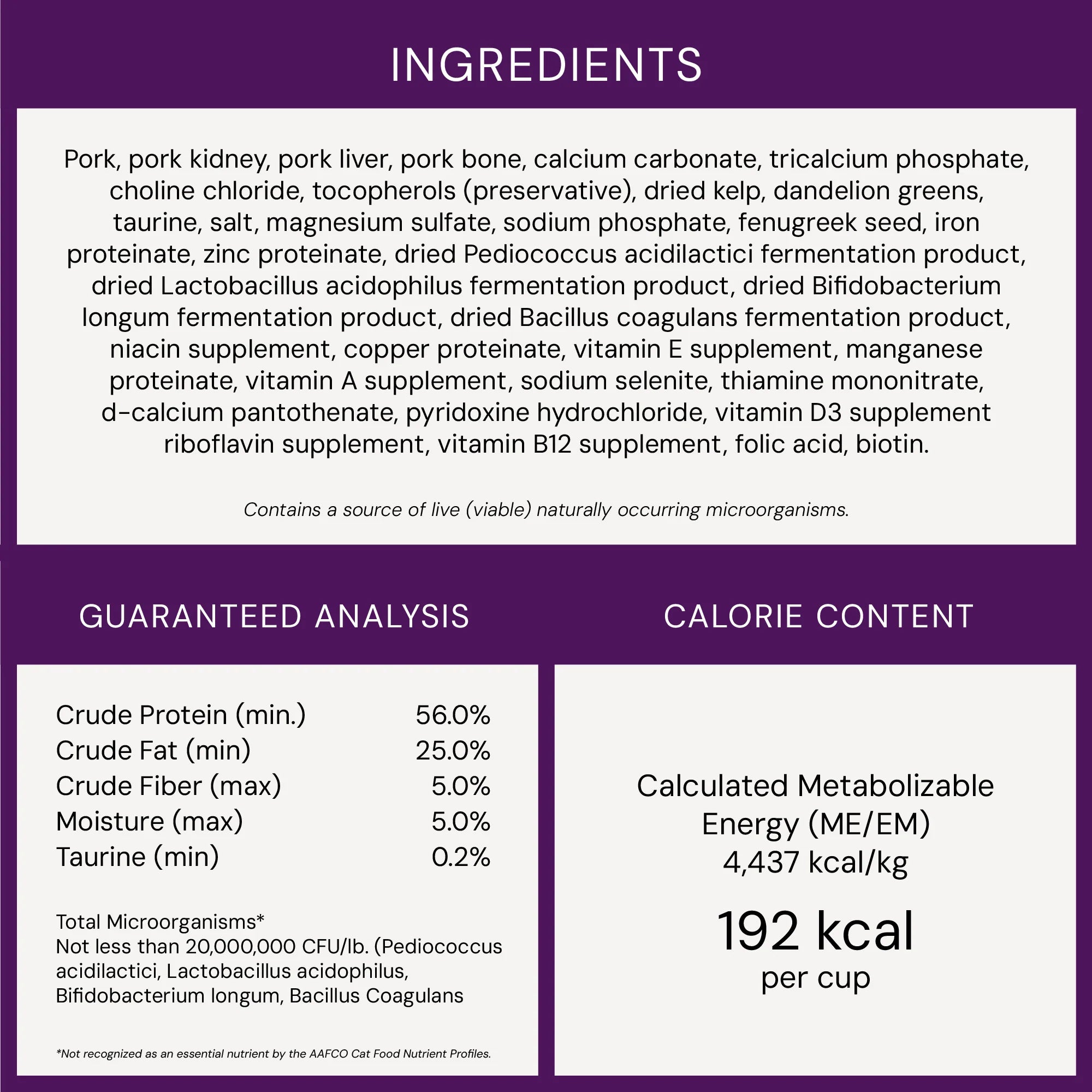 Pork, Pork Kidney, Pork Liver, Pork Bone, Calcium Carbonate, Tricalcium Phosphate, Choline Chloride, Mixed Tocopherols (preservative), Dried Kelp, Dandelion Greens, Taurine, Salt, Magnesium Sulfate, Sodium Phosphate, Fenugreek Seed, Iron Proteinate, Zinc Proteinate, Dried Pediococcus Acidilactici fermentation product, Dried Lactobacillus Acidophilus fermentation product, Dried Bifidobacterium Longum fermentation product, Dried Bacillus Coagulans fermentation product, Niacin Supplement, Copper Proteinate, Vitamin E Supplement, Manganese Proteinate, Vitamin A Supplement, Sodium Selenite, Thiamine Mononitrate, D-calcium Pantothenate, Pyridoxine Hydrochloride, Vitamin D3 Supplement, Riboflavin Supplement, Vitamin B12 Supplement, Folic Acid, Biotin