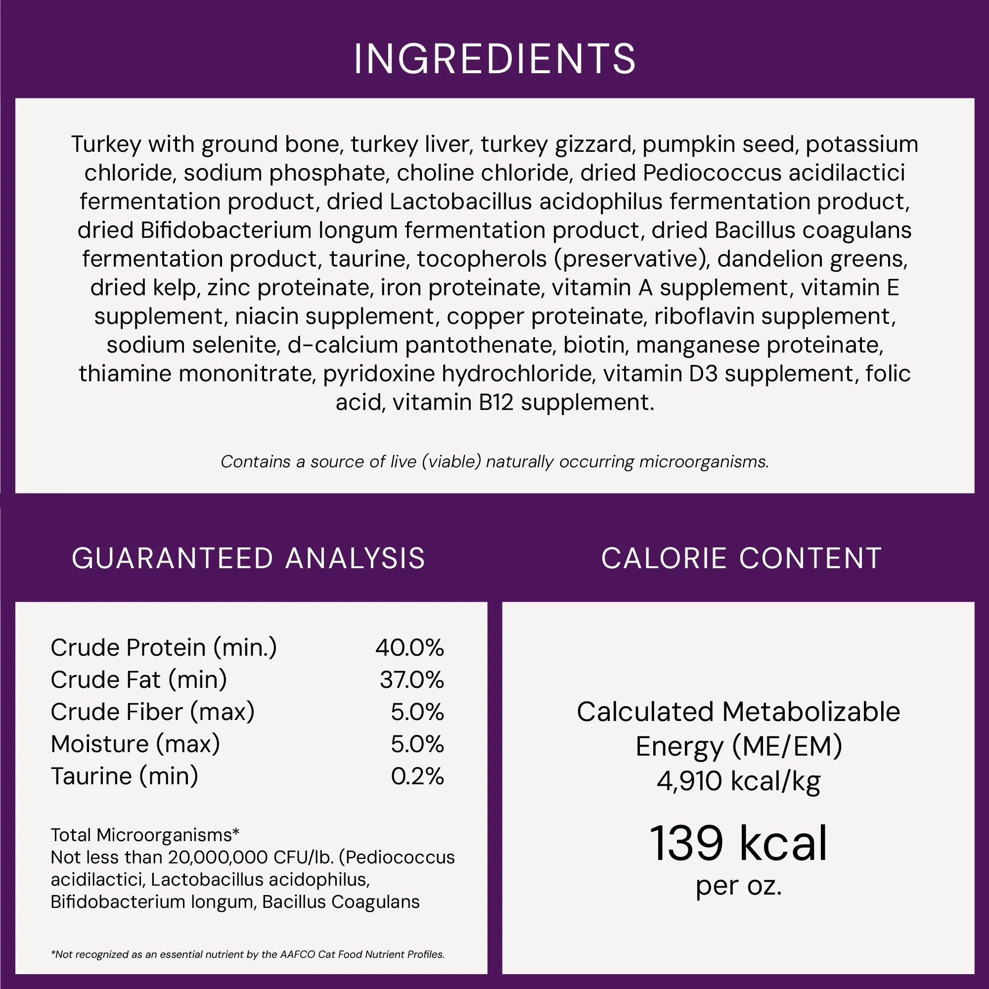 Salmon with Ground Bone, Ground Cod with Bones, Cod Liver Oil, Pumpkin Seed, Potassium Chloride, Sodium Phosphate, Choline Chloride, Fenugreek Seed, Dried Pediococcus Acidilactici fermentation product, Dried Lactobacillus Acidophilus fermentation product, Dried Bifidobacterium Longum fermentation product, Dried Bacillus Coagulans fermentation product, Taurine, Mixed Tocopherols (preservative), Dandelion, Dried Kelp, Zinc Proteinate, Iron Proteinate, Vitamin A Supplement, Vitamin E Supplement, Niacin Supplement, Copper Proteinate, Riboflavin Supplement, Sodium Selenite, D-calcium Pantothenate, Biotin, Manganese Proteinate, Thiamine Mononitrate, Pyridoxine Hydrochloride, Vitamin D3 Supplement, Folic Acid, Vitamin B12 Supplement