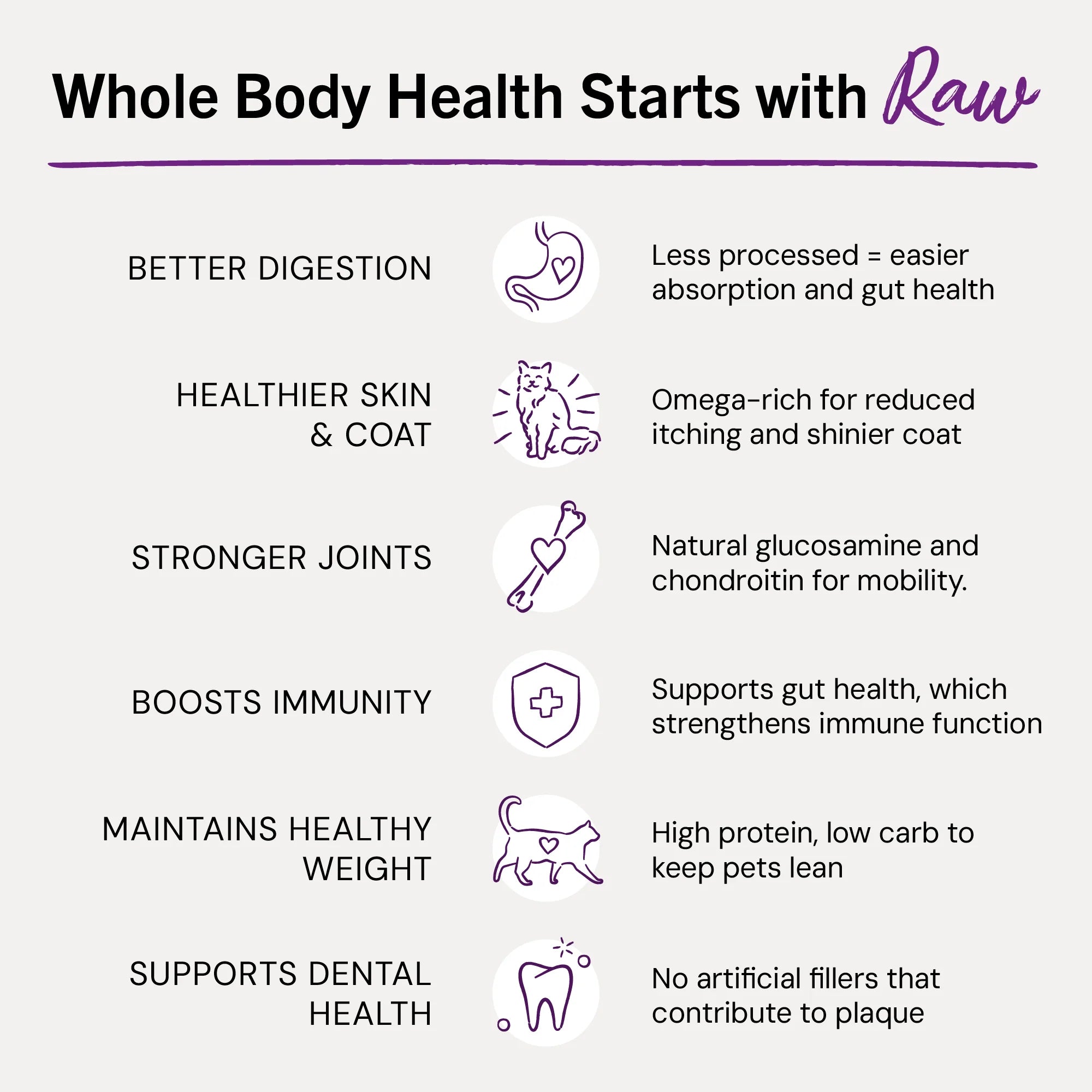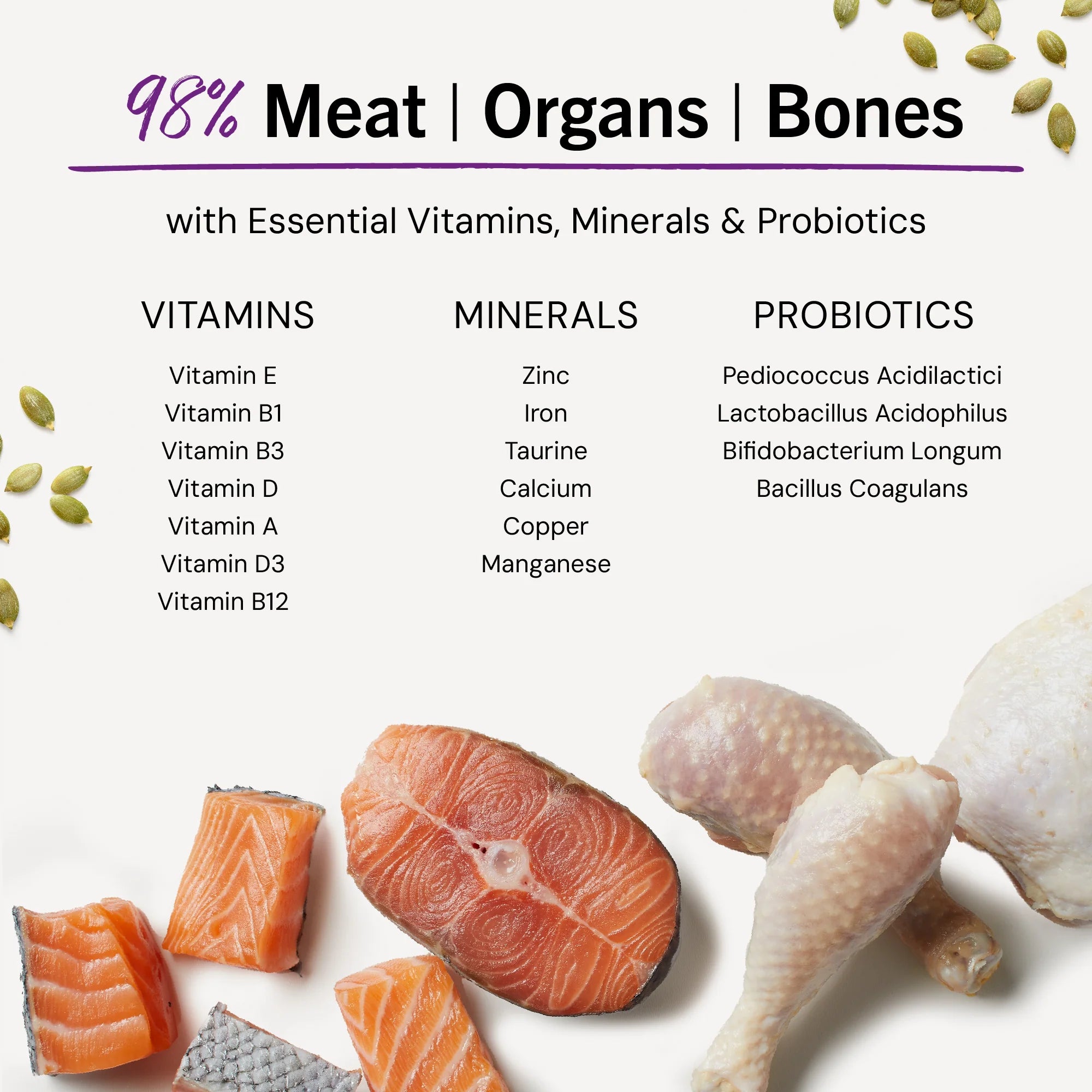 Salmon with Ground Bone, Chicken with Ground Bone, Chicken Liver, Chicken Gizzard, Pumpkin Seed, Potassium Chloride, Sodium Phosphate, Choline Chloride, Fenugreek Seed, Dried Pediococcus Acidilactici fermentation product, Dried Lactobacillus Acidophilus fermentation product, Dried Bifidobacterium Longum fermentation product, Dried Bacillus Coagulans fermentation product, Taurine, Mixed Tocopherols (preservative), Dandelion, Dried Kelp, Zinc Proteinate, Iron Proteinate, Vitamin A Supplement, Vitamin E Supplement, Niacin Supplement, Copper Proteinate, Riboflavin Supplement, Sodium Selenite, D-calcium Pantothenate, Biotin, Manganese Proteinate, Thiamine Mononitrate, Pyridoxine Hydrochloride, Vitamin D3 Supplement, Folic Acid, Vitamin B12 Supplement