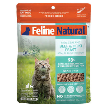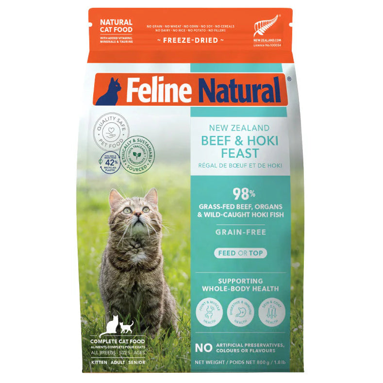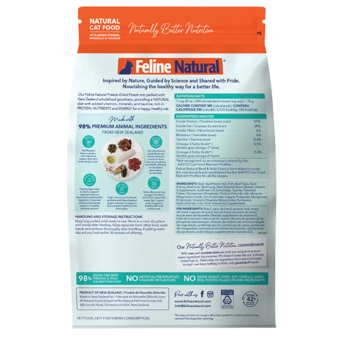 Our complete and balanced Freeze-Dried New Zealand Beef & Hoki Feast contains 98% Grass-fed & Grass-finished Beef & Organs, and Wild-caught Hoki Fish, with New Zealand Green Mussels, Flaxseed Flakes, Oils, Kelp, Vitamins, Minerals and Taurine in support of your cat's whole-body health.