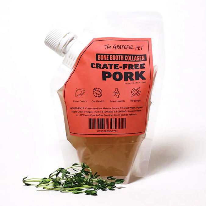 Elevate your pet’s wellness with The Grateful Pet Crate-Free Pork Bone Broth Collagen that is made in Singapore. Our crate-free pork contains natural collagen, helping heal and soothe the gut lining while supporting joint, skin, and coat health. Our pork broth is infused with thyme, promoting a healthy digestive tract and aids with irritable bowels thanks to its antibacterial properties.