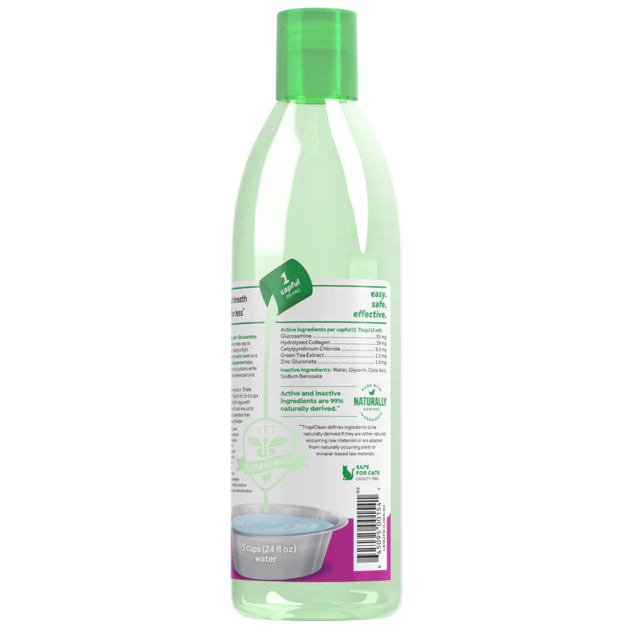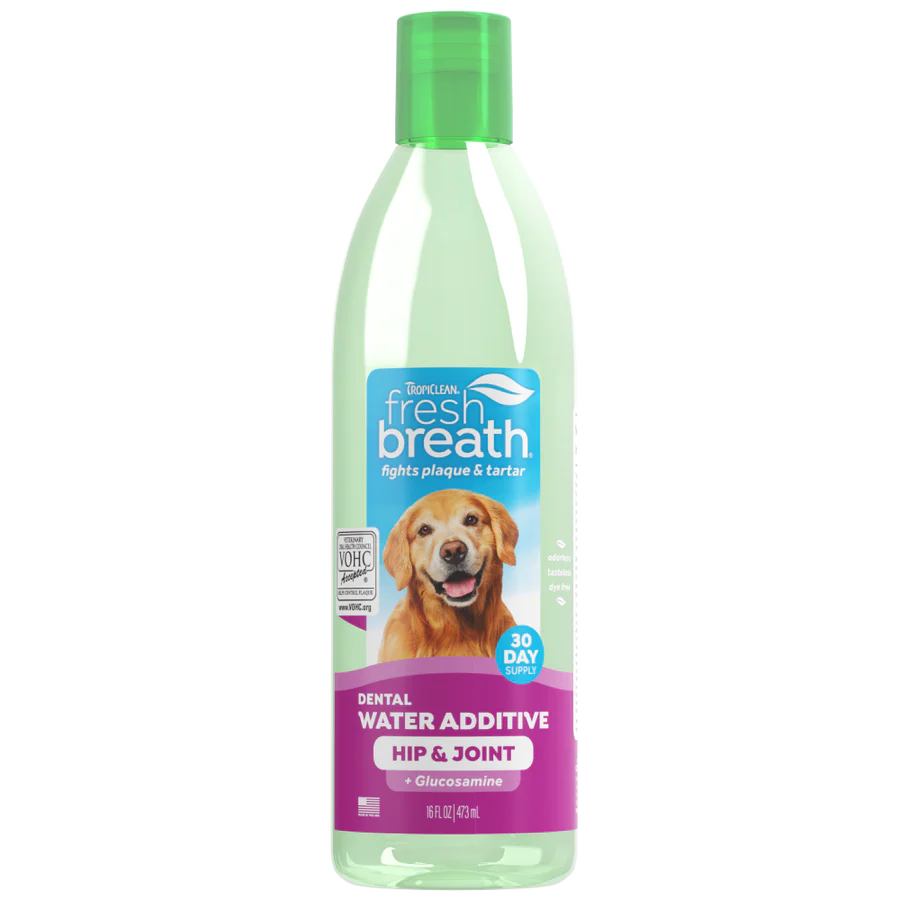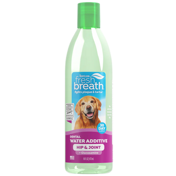 Fresh Breath by TropiClean Oral Care Water Additive + Hip & Joint Support for Pets is the easy, no-brush solution to keep your pet’s mouth healthy while supporting their mobility. Formulated with glucosamine to promote your pet's healthy hips and joints, this tasteless water additive also provides daily plaque and tartar defense for dogs and cats—simply add it to their water bowl once a day. In just 14 days, it helps reduce plaque and tartar build-up while freshening breath for up to 12 hours.