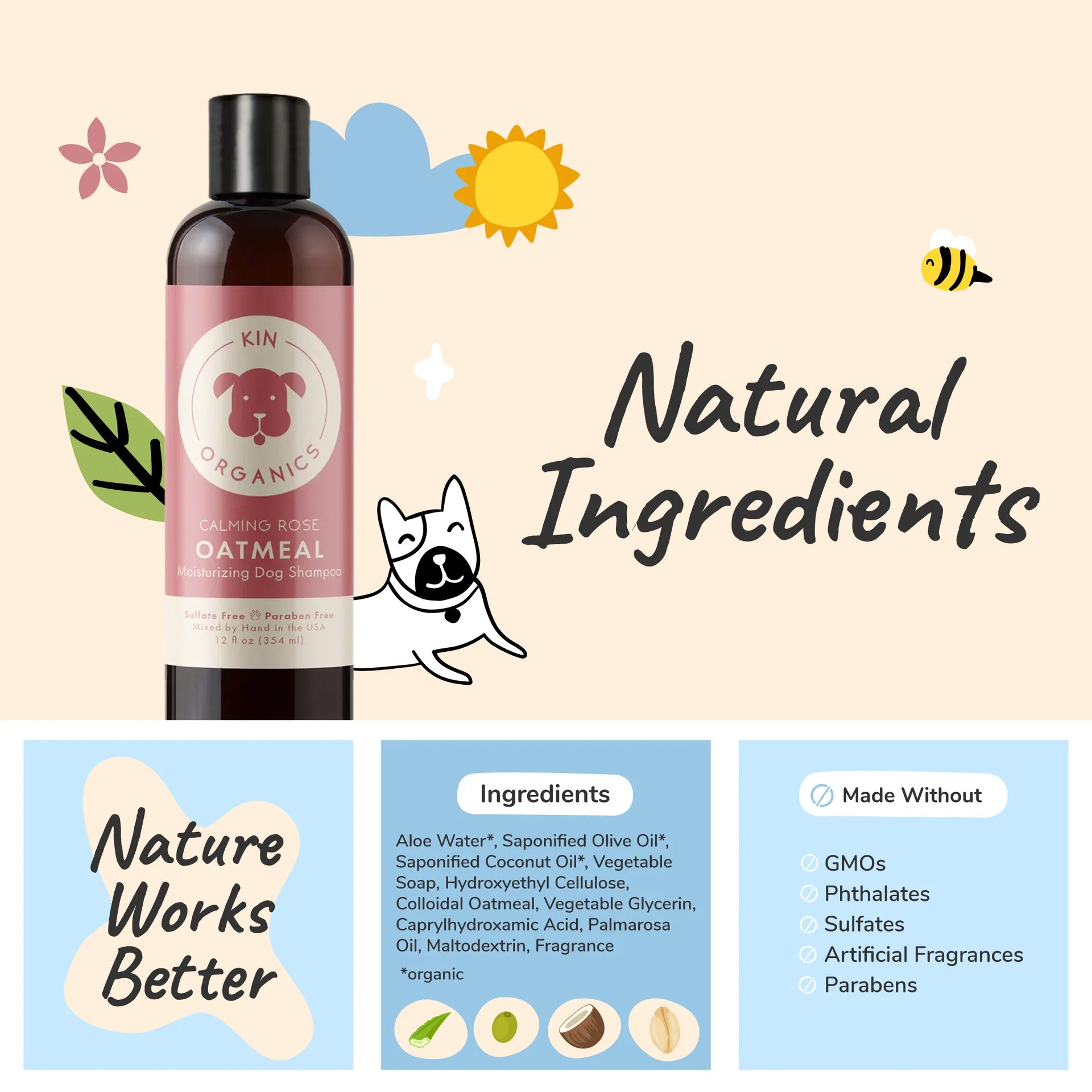 Visit Kin + Kind Website to know more about Kin + Kind Kin Organics Calming Rose Oatmeal Moisturizing Dog Shampoo