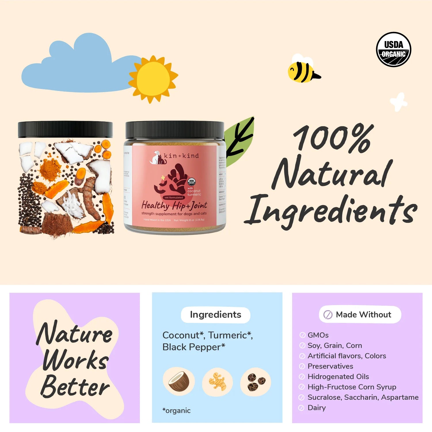 - Made in the USA: Every kin+kind supplement is lovingly mixed, labeled, and shipped by the hands of our employees paid a responsible, living wage in our certified USDA organic facility.