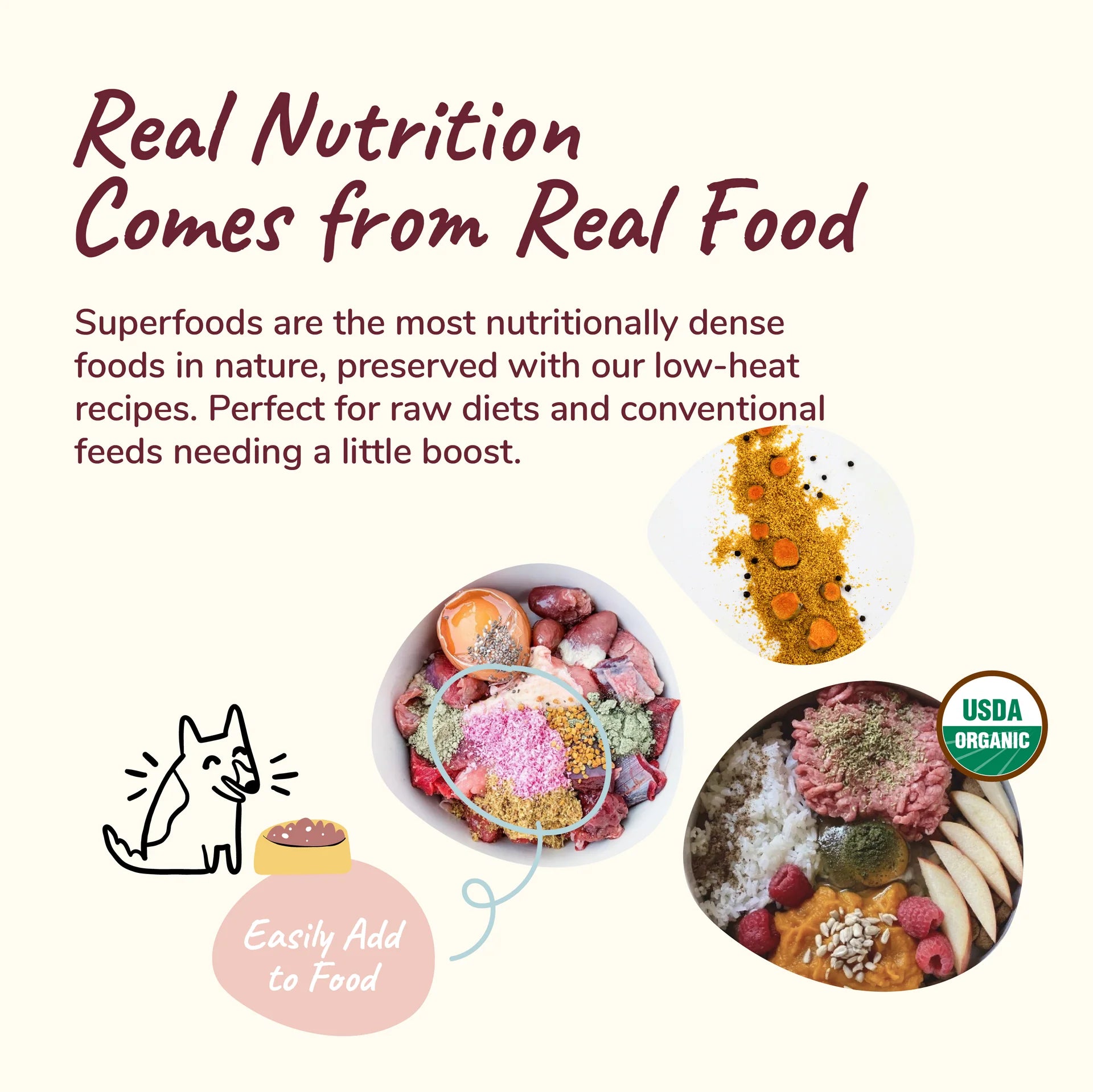- Real Superfoods: Pets love our supplements because they're made with only real superfoods and nothing else. No GMOs and no grains. They taste good and can be easily sprinkled on top of any type of diet.