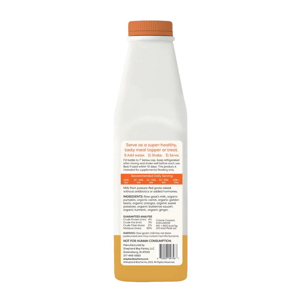 Raw Goat Milk, Organic pumpkin, Organic carrot, Organic sweet potato, Organic turmeric, Organic Ginger