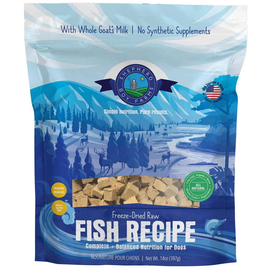 Shepherd Boy Farms’ award-winning fish recipe isn’t just food, it’s a promise: real ingredients, real nutrition, and real results for your dog. Crafted with organic fruits and vegetables proudly sourced in the USA, wild-caught fish, and nourishing goat’s milk, our freeze-dried formula is so naturally balanced that no synthetic vitamins or minerals are needed. It’s the meal your dog deserves and the convenience you’ll love.