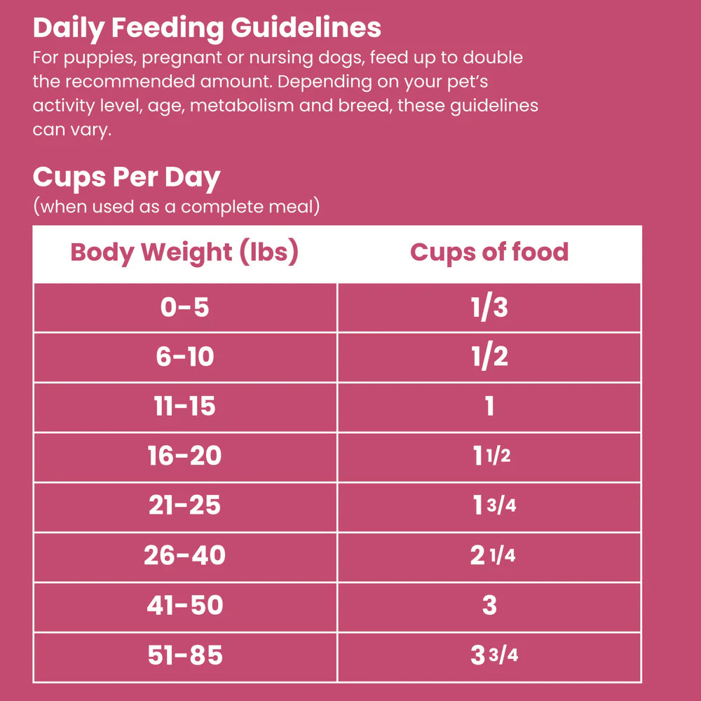 For Puppies, Pregnant, or Nursing Dogs, feed up to double the recommended amount. Depending on your pet’s activity level, age, metabolism and breed these guidelines can vary.