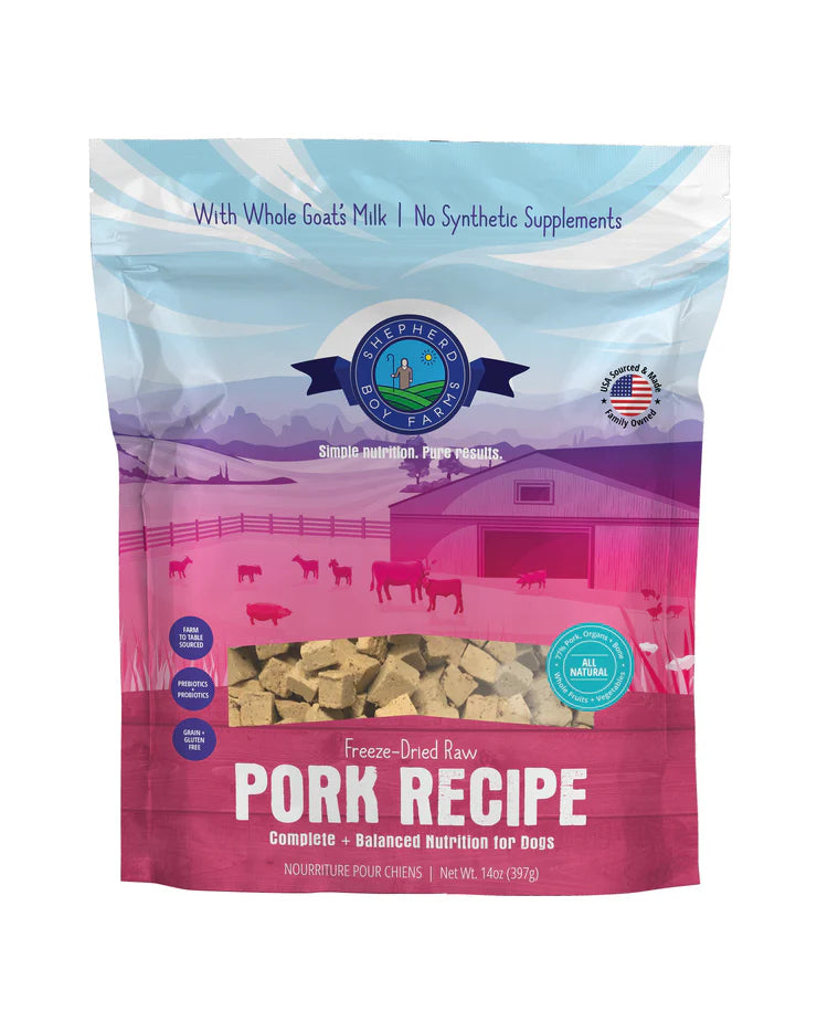 Shepherd Boy Farms’ award-winning pork recipe isn’t just food, it’s a promise: real ingredients, real nutrition, and real results for your dog. Crafted with organic fruits and vegetables proudly sourced in the USA, high-quality pork + organ meat, and nourishing goat’s milk, our freeze-dried formula is so naturally balanced that no synthetic vitamins or minerals are needed. It’s the meal your dog deserves and the convenience you’ll love.