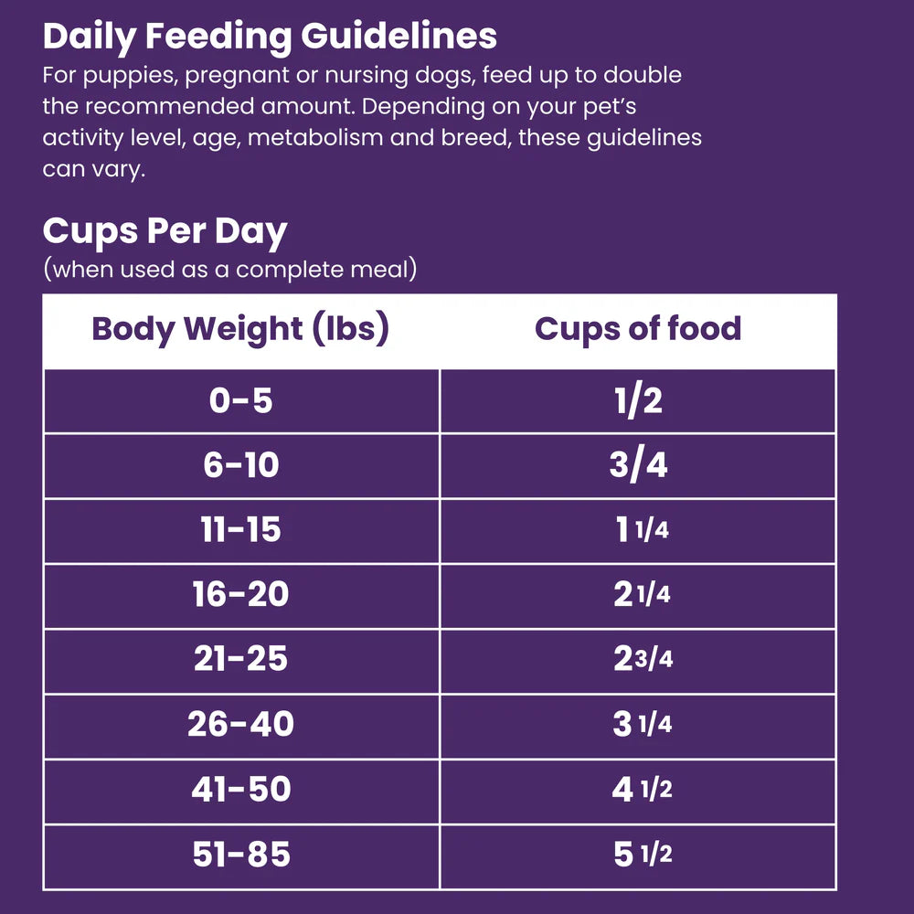For Puppies, Pregnant, or Nursing Dogs, feed up to double the recommended amount. Depending on your pet’s activity level, age, metabolism and breed these guidelines can vary.