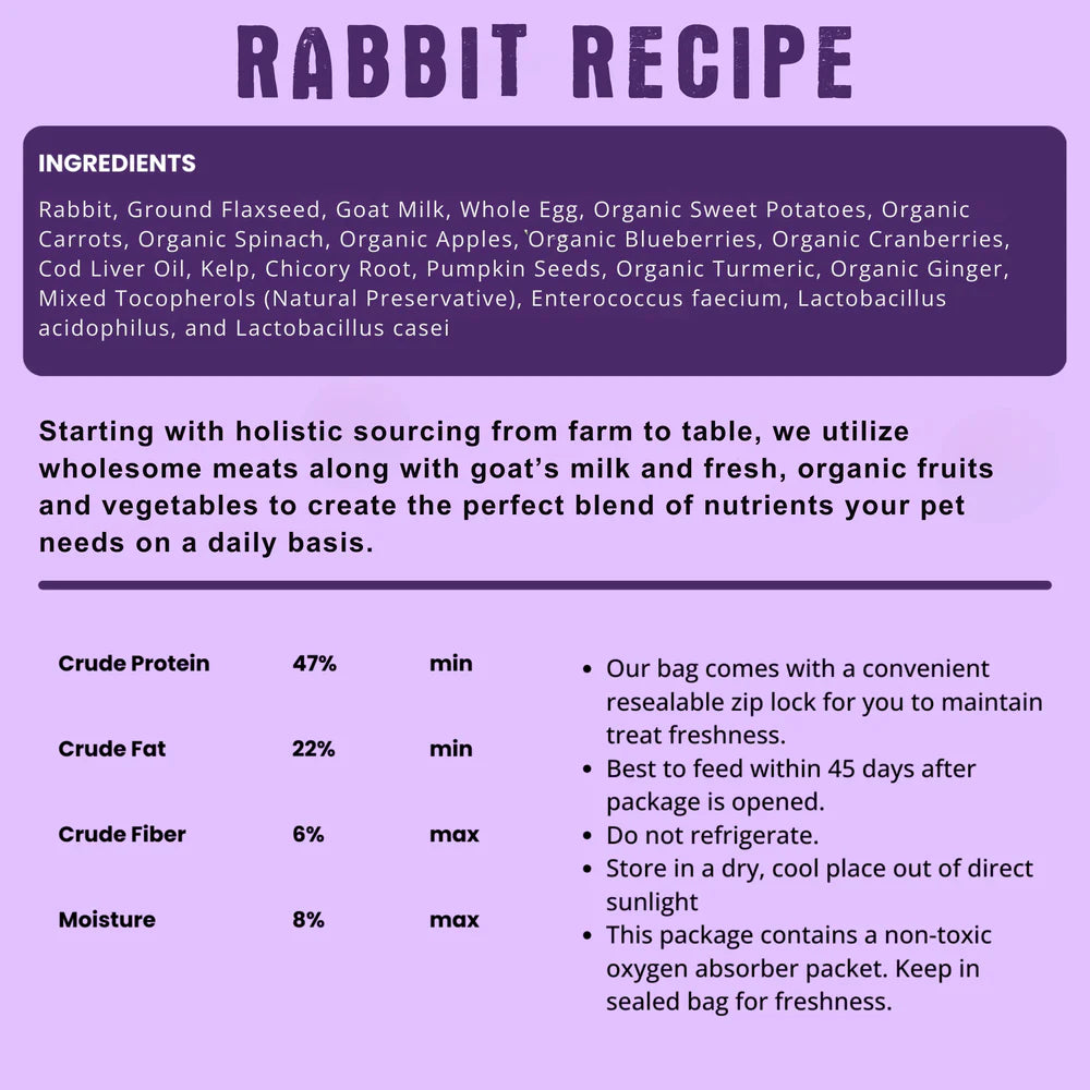 Rabbit, Ground Flaxseed, Goat Milk, Whole Egg, Organic Sweet Potatoes, Organic Carrots, Organic Spinach, Organic Apples, Organic Blueberries, Organic Cranberries, Cod Liver Oil, Kelp, Chicory Root, Pumpkin Seeds, Organic Turmeric, Organic Ginger, Mixed Tocopherols (Natural Preservative), Enterococcus faecium, Lactobacillus acidophilus, and Lactobacillus casei