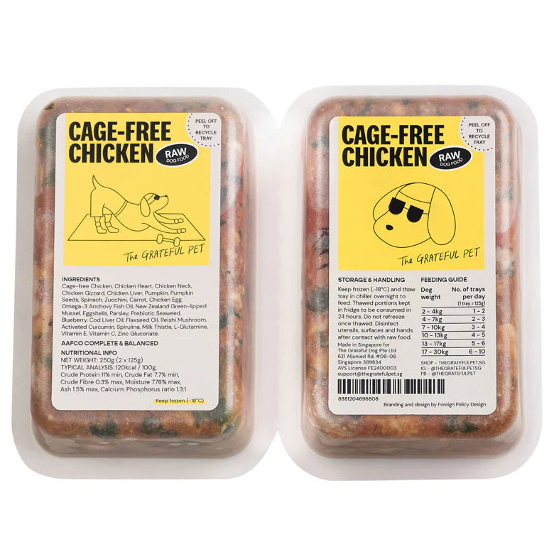 Cage-free Chicken, Chicken Heart, Chicken Neck, Chicken Gizzard, Chicken Liver, Chicken Egg, Pumpkin, Pumpkin Seedss, Spinach, Zucchini, Carrot, Omega-3 Anchovy Oil, Eggshells, Parsley, Prebiotic Seaweed, Cod Liver Oil, Blueberry, FlaxSeeds Oil, L-Glutamine, Alpha-tocopherol, Reishi Mushroom, Vitamin C, New Zealand Green-lipped Mussel, Activated Curcumin, Spirulina, Zinc Gluconate, Milk Thistle