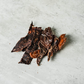 PAWFF's Mixed Berries Pork Jerky are thinly sliced, marinated in a concoction of berries and dehydrated to perfect crispiness. Great crunch for both cats and dogs.