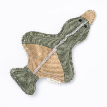 The toy is made of linen type cloth in a colour combination of bush green and sand colour.
