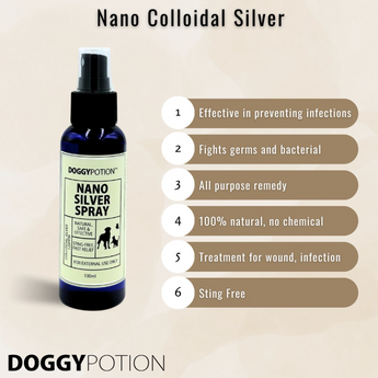 Doggypotion Nano Silver Spray is a 100% Natural, non-toxic, sting-free topical anti-bacterial healing agent. Provides instant releif for common pet irritations and promotes natural healing.