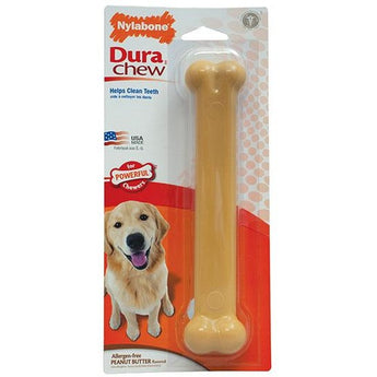 What dog can resist yummy peanut butter? Made with tough, durable nylon, the Power Chew DuraChew Peanut Butter Chew Toy was crafted with powerful chewers in mind. It provides long-lasting enjoyment, satisfies the natural urge to chew, and encourages positive chewing habits. Plus, the bristles raised during chewing promote clean teeth and help control plaque and tartar buildup. Go ahead and give your dog a Nylabone! Made in the USA!