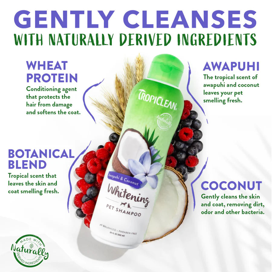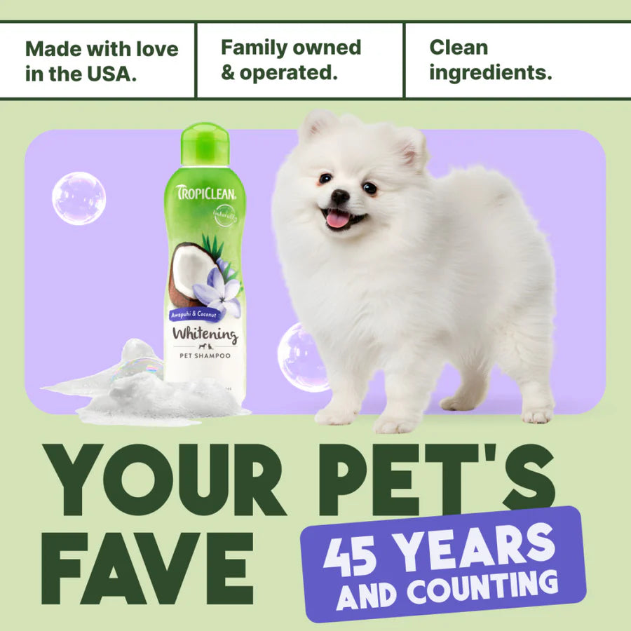 Bring out your pet’s natural brilliance with TropiClean Awapuhi & Coconut Whitening Pet Shampoo for dogs and cats. Formulated to gently cleanse, whiten, and brighten coats of all colors—especially white or light fur—this luxurious pet shampoo creates a rich, tropical lather that lifts dirt while deeply moisturizing skin and coat.