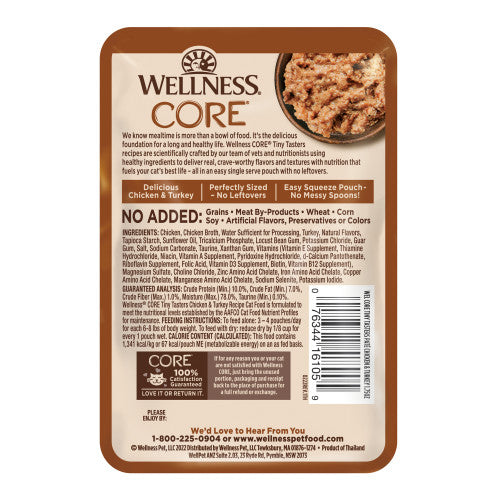 Wellness® CORE® Tiny Tasters™ Chicken & Turkey Recipe Cat Food is formulated to meet the nutritional levels established by the AAFCO Cat Food Nutrient Profiles for maintenance.
