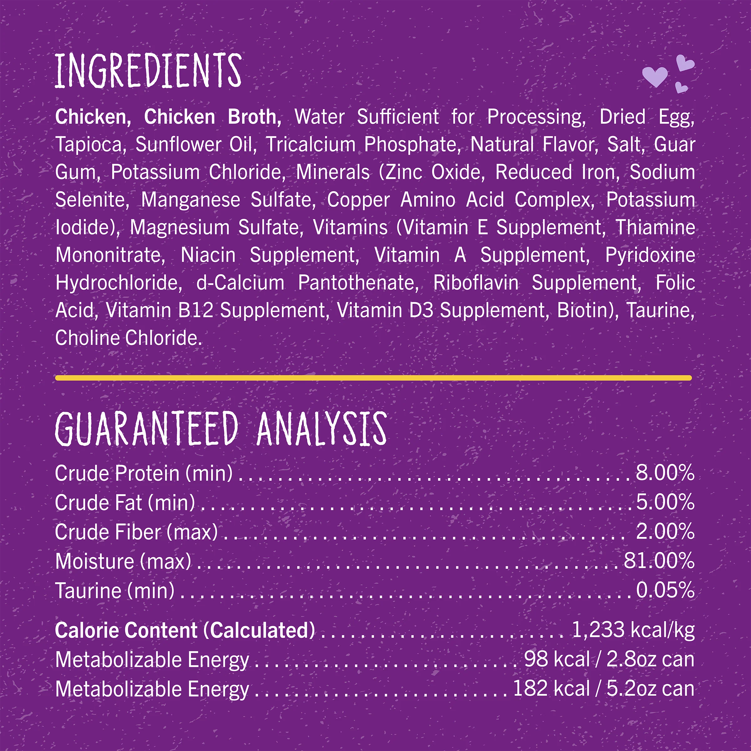 Cage-Free Chicken, Chicken Broth, Water Sufficient for Processing, Dried Egg, Tapioca, Sunflower Oil, Tricalcium Phosphate, Natural Flavor, Salt, Guar Gum, Potassium Chloride, Minerals (Zinc Oxide, Reduced Iron, Sodium Selenite, Manganese Sulfate, Copper Amino Acid Complex, Potassium Iodide), Magnesium Sulfate, Vitamin E Supplement, Thiamine Mononitrate, Niacin Supplement, Vitamin A Supplement, Pyridoxine Hydrochloride, D-calcium Pantothenate, Riboflavin Supplement, Folic Acid, Vitamin B12 Supplement, Vitamin D3 Supplement, Biotin, Taurine, Choline Chloride