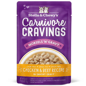 Visit Stella & Chewy Website to know more about Stella & Chewy's Carnivore Cravings Morsels'N'Gravy Shreds Chicken & Beef Recipe Pouch Wet Cat Food