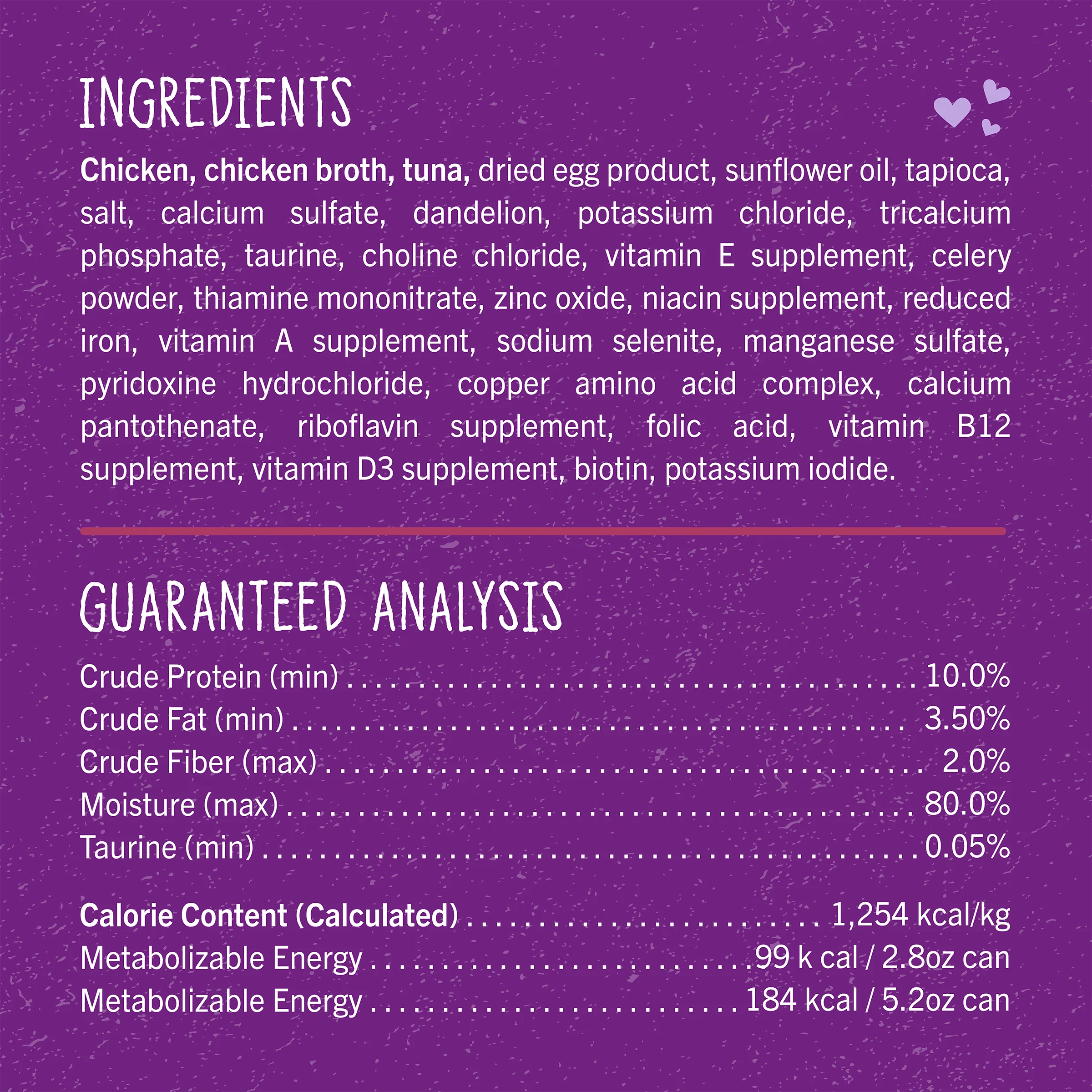 Cage-Free Chicken, Chicken Broth, Wild Caught Tuna, Dried Egg, Sunflower Oil, Tapioca, Salt, Calcium Sulfate, Dandelion Greens, Potassium Chloride, Tricalcium Phosphate, Taurine, Choline Chloride, Vitamin E Supplement, Celery Powder, Thiamine Mononitrate, Zinc Oxide, Niacin Supplement, Reduced Iron, Vitamin A Supplement, Sodium Selenite, Manganese Proteinate, Pyridoxine Hydrochloride, Copper Amino Acid Complex, D-calcium Pantothenate, Riboflavin Supplement, Folic Acid, Vitamin B12 Supplement, Vitamin D3 Supplement, Biotin, Potassium Iodide