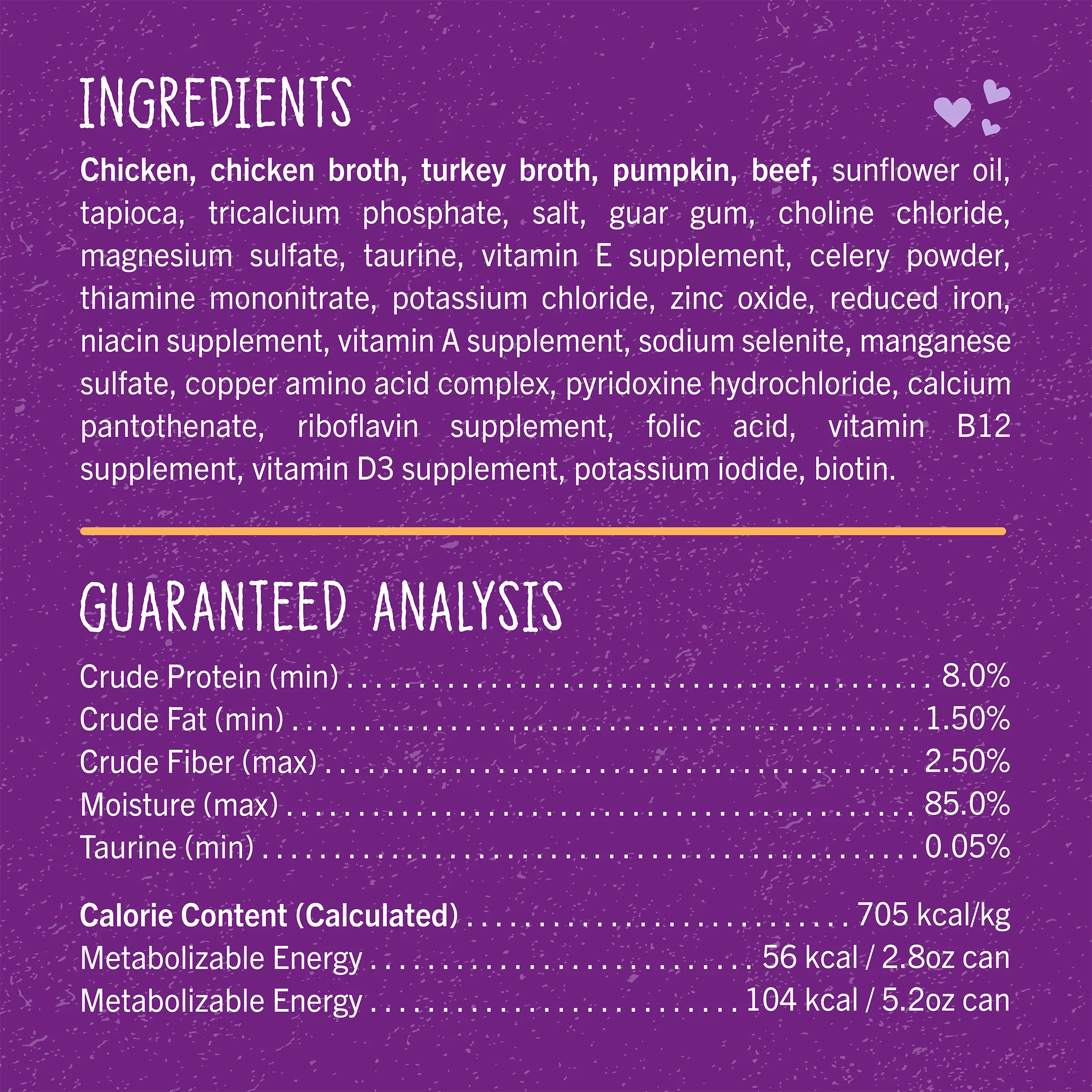 Cage-Free Chicken, Chicken Broth, Turkey Broth, Pumpkin, Beef, Sunflower Oil, Tapioca, Tricalcium Phosphate, Salt, Guar Gum, Choline Chloride, Magnesium Sulfate, Taurine, Vitamin A Supplement, Celery Powder, Thiamine Mononitrate, Potassium Chloride, Zinc Oxide, Reduced Iron, Niacin Supplement, Sodium Selenite, Manganese Sulfate, Copper Amino Acid Complex, Pyridoxine Hydrochloride, D-calcium Pantothenate, Riboflavin Supplement, Folic Acid, Vitamin B12 Supplement, Vitamin D3 Supplement, Potassium Iodide, Biotin
