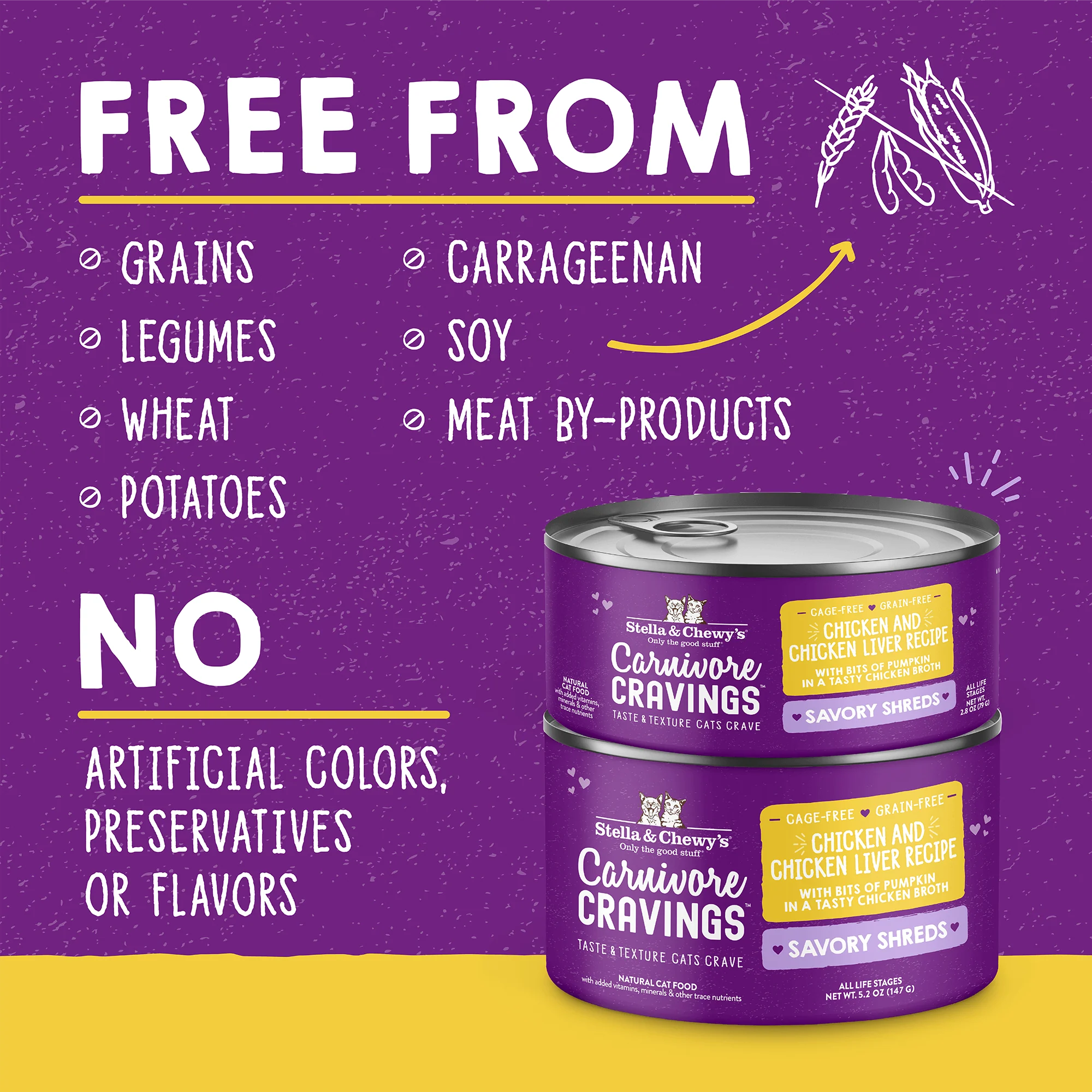 • Free from grains, legumes, potatoes, carrageenan, wheat, meat by-products, soy, artificial colors, preservatives and flavors
