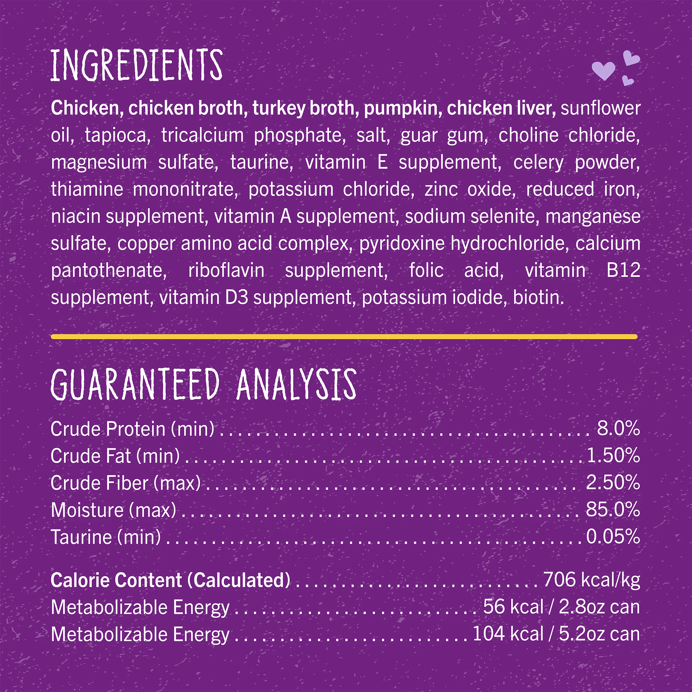 Cage-Free Chicken, Chicken Broth, Turkey Broth, Pumpkin, Chicken Liver, Sunflower Oil, Tapioca, Tricalcium Phosphate, Salt, Guar Gum, Choline Chloride, Magnesium Sulfate, Taurine, Vitamin E Supplement, Celery Powder, Thiamine Mononitrate, Potassium Chloride, Zinc Oxide, Reduced Iron, Niacin Supplement, Vitamin A Supplement, Sodium Selenite, Manganese Sulfate, Copper Amino Acid Complex, Pyridoxine Hydrochloride, D-calcium Pantothenate, Riboflavin Supplement, Folic Acid, Vitamin B12 Supplement, Vitamin D3 Supplement, Potassium Iodide, Biotin