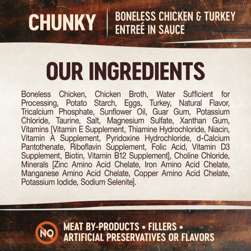 Wellness® CORE® Signature Selects® Chunky Boneless Chicken & Turkey Entrée in Sauce is formulated to meet the nutritional levels established by the AAFCO Cat Food Nutrient Profiles for maintenance.