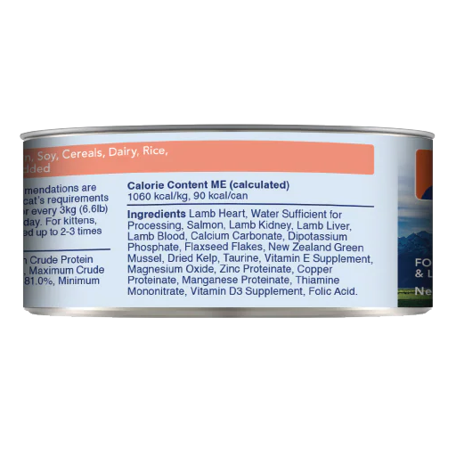 Lamb Heart, Water Sufficient for Processing, Salmon, Lamb Kidney, Lamb Liver, Lamb Blood, Calcium Carbonate, Dipotassium Phosphate, Flaxseed Flakes, New Zealand Green Mussel, Dried Kelp, Taurine, Vitamin E Supplement, Magnesium Oxide, Zinc Proteinate, Copper Proteinate, Manganese Proteinate, Thiamine Mononitrate, Vitamin D3 Supplement, Folic Acid.