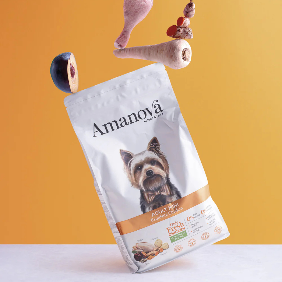 Amanova Adult mini is a hypoallergenic food for adult dogs of small breeds. Prepared only with fresh chicken as the only animal source, it contains a balanced mix of biological proteins that support the proper development and maintenance of the muscular system.