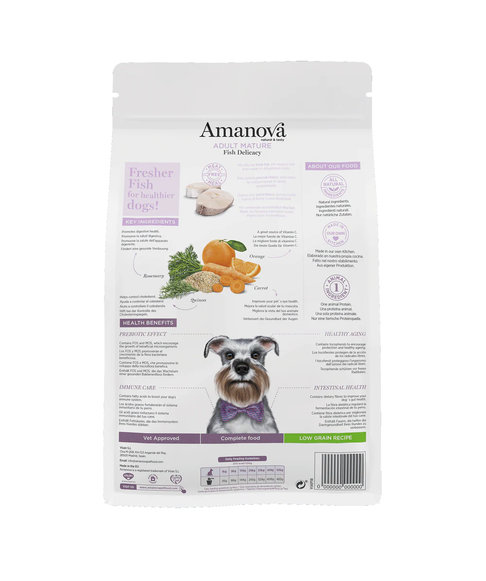 Amanova Adult Mature is a hypoallergenic food for senior dogs of any breed or size. We have prepared it exclusively with fresh white fish as the only animal source, as it provides significant amounts of EPA, Omega-3, and Omega-6 fatty acids, essential for cardiovascular, joint, and cognitive health in older dogs.