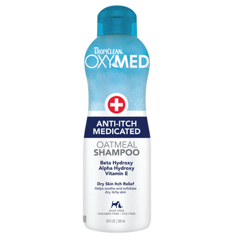 TropiClean OxyMed Medicated Anti-Itch Shampoo for Dogs & Cats delivers fast-acting relief for dry, itchy, and irritated skin. Formulated with a powerful blend of alpha hydroxy, beta hydroxy, and tea tree oil, this medicated pet shampoo exfoliates the skin’s surface and penetrates deep into the pores to cleanse away impurities while calming inflammation. The oatmeal-infused formula deeply moisturizes, conditions, and helps restore your pet’s skin and coat to a healthy, comfortable state.