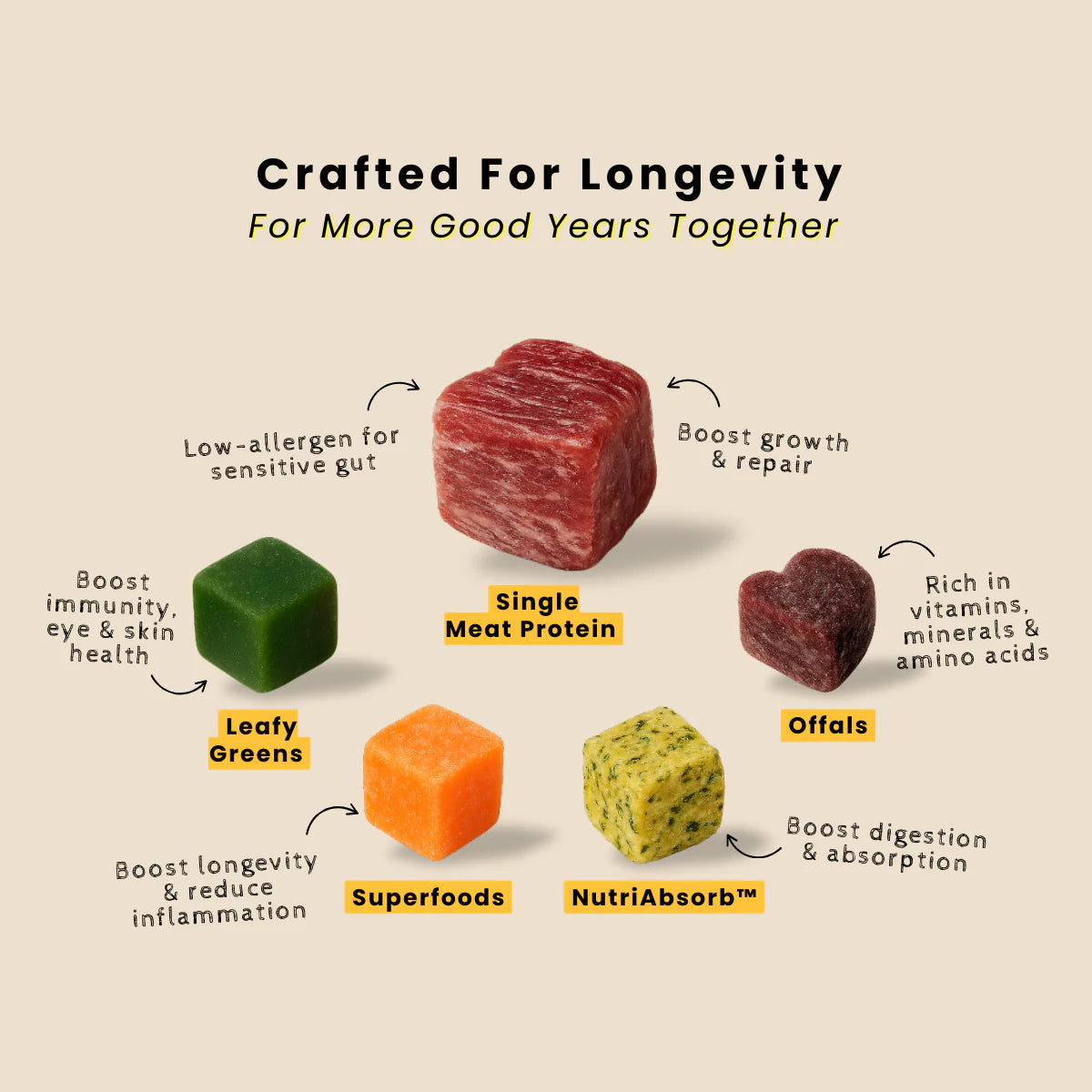 We partner with growers and producers who share our values, and are pet lovers themselves. This means the same meats, fruits, and vegetables we source are the same ingredients served in restaurants and butcheries in Singapore. But here, they’re part of something just as meaningful - our pet’s health, happiness, and longevity. That's why we created our fresh meals in chunkier texture, so you can see the quality of our ingredients and feed with confidence.
