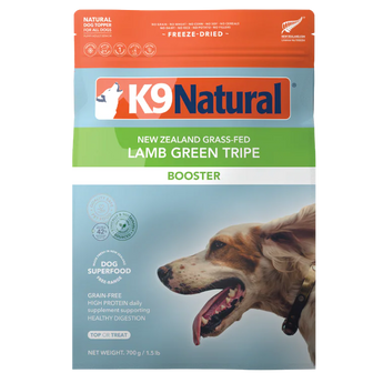 Sourcing only the highest quality New Zealand grass-fed, free-range Lamb Green Tripe, K9 Natural Green Tripe Booster aids in healthy digestion, nourishes skin & coat, assists immune response, and improves their overall health & well-being.