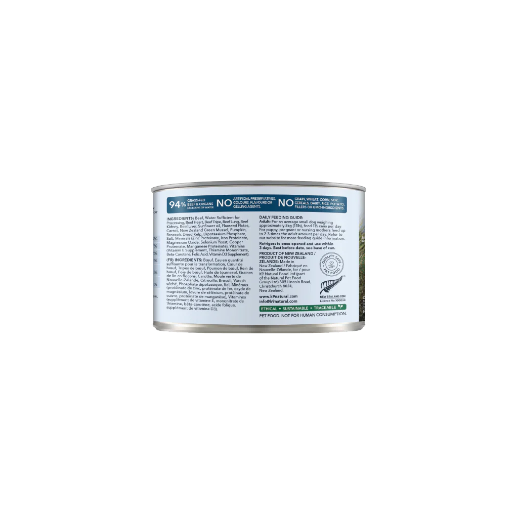 Beef, Water Sufficient for Processing, Beef Heart, Beef Tripe, Beef Lung, Beef Kidney, Beef Liver, Sunflower oil, Flaxseed Flakes, Carrot, New Zealand Green Mussel, Pumpkin, Broccoli, Dried Kelp, Dipotassium Phosphate, Salt, Minerals (Zinc Proteinate, Iron Proteinate, Magnesium Oxide, Selenium Yeast, Copper Proteinate, Manganese Proteinate), Vitamins (Vitamin E Supplement, Thiamine Mononitrate, Beta-Carotene, Folic Acid, Vitamin D3 Supplement).