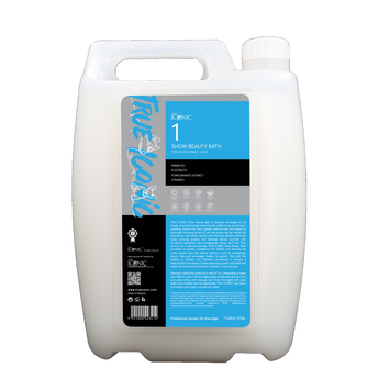 TRUE ICONIC Show Beauty Bath is specially formulated for all breeds, ensuring thorough cleansing that swiftly rinses out, leaving a sparkling, residue-free coat. It greatly reduces mats and tangles by selectively removing excess oil and dirt, preserving the natural oils essential for coat health. Safe for even the most sensitive skins and coats, including puppies and lactating female dogs. Enriched with all-natural ingredients like pomegranate extract and free from alcohol, oil, or silicone products, TRUE ICONIC Show Beauty Bath promotes fur growth, strengthens hair follicles, and enriches the coat's natural color and texture. Vitamin E, with its antioxidants, boosts cells and encourages healthy fur growth. Plus, with the addition of Prebiotic and Postbiotic combination, it nurtures a balanced skin microbiome, further enhancing overall coat health and vitality. No Animal Extract, Sodium Chloride or Coloring Dyes.